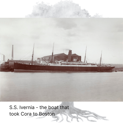 In 1912, Cora made a bold and life-changing decision—at nearly 40 years old, she chose to emigrate to America. She boarded the SS Ivernia from Liverpool, traveling second class to Boston, Massachusetts. For a single woman of her age and background, this was an act of remarkable courage and vision.